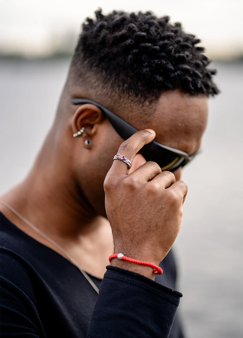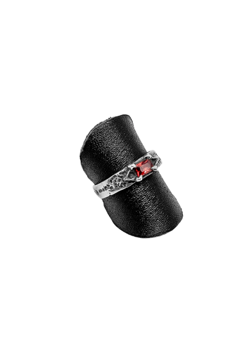 Silver 950 ring with red zirconia. 100% handcrafted, the ring has details and elements inspired in nordic mitology.
